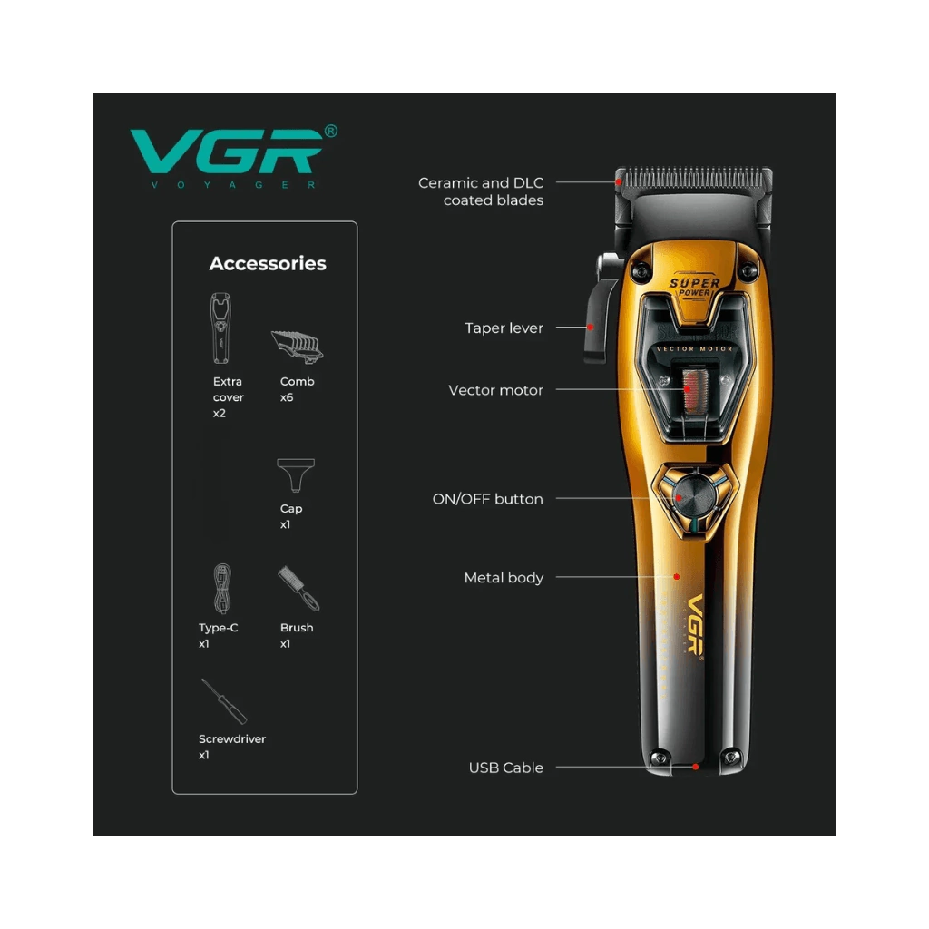 A VGR V-668 é uma máquina de corte profissional desenvolvida para barbeiros que buscam potência, versatilidade e durabilidade em um único equipamento. Com design robusto em corpo metálico, lâminas de alta tecnologia e motor vetorial de última geração, ela garante cortes precisos e resultados de nível profissional.