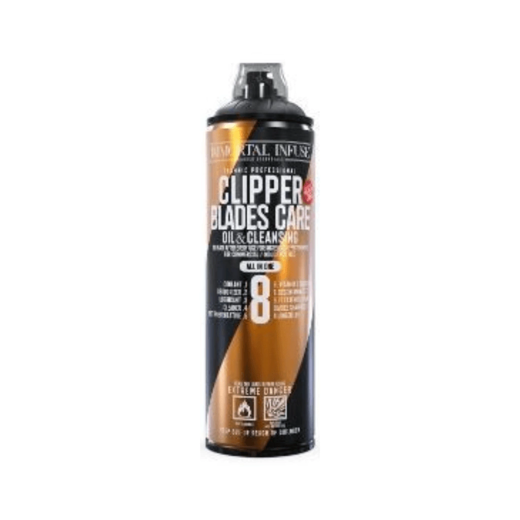 IMMORTAL INFUSE CLIPPER BLADES CARE esfria, desodoriza, lubrifica, limpa, enferruja e esteriliza suas facas de corte graças à sua fórmula 8 em 1. É enriquecido com vitamina E. É ideal para remover pêlos, descamação, poeira e depósitos. Deixe um filme lubrificante leve que reduz o atrito nas lâminas, o que suaviza o processo de corte e aumenta a eficiência da lâmina. Lubrifique as lâminas de corte após cada uso para maior eficiência. Pode ser usado em todos os metais, como lâminas de barbear, pinças, tesouras de cabelo e cortadores de unhas.